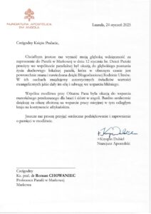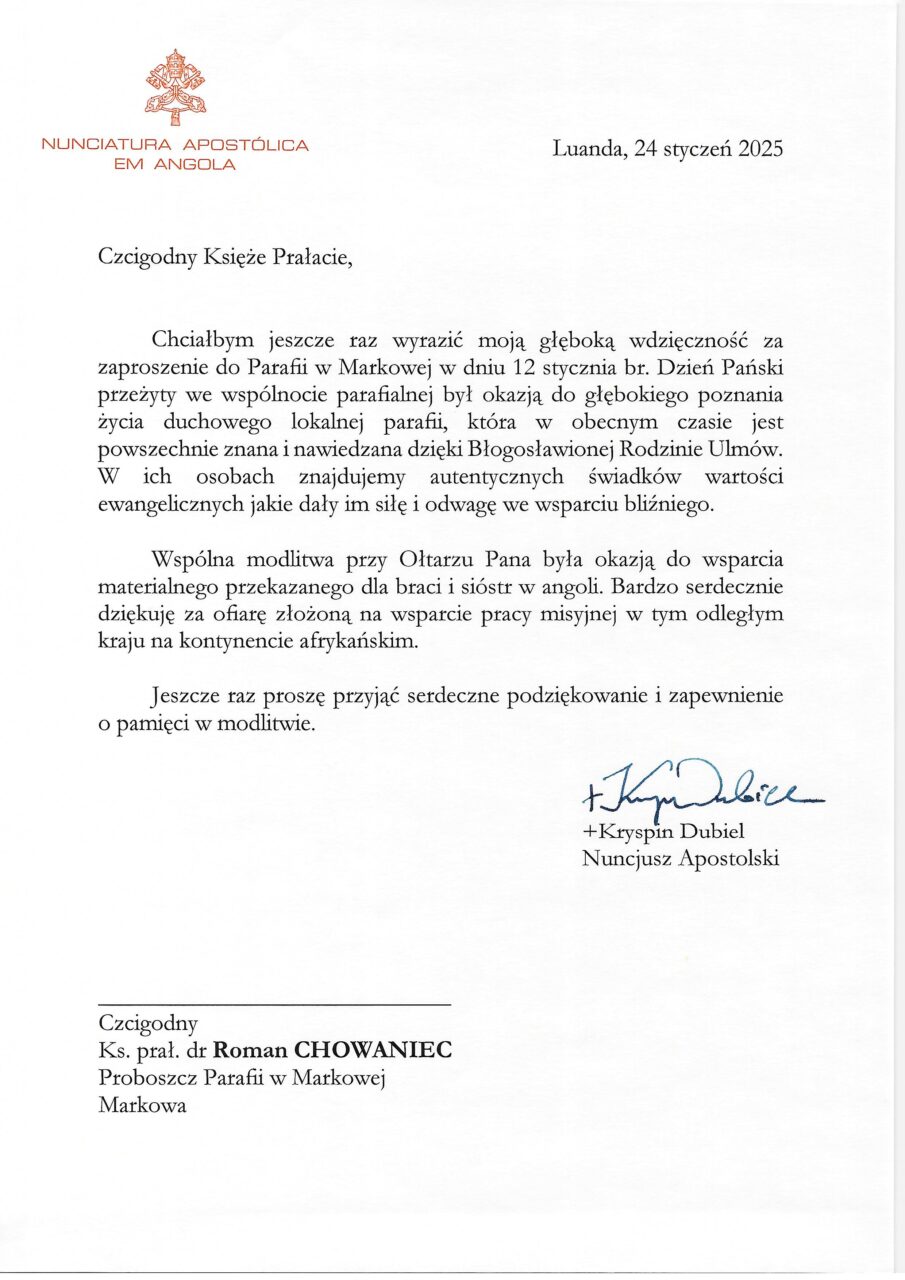 Po powrocie do Angoli, Ksiądz Arcybiskup przesłał podziękowanie za zaproszenie oraz za ofiary złożone na potrzeby Kościoła w Angoli.
