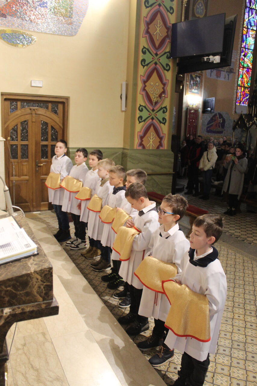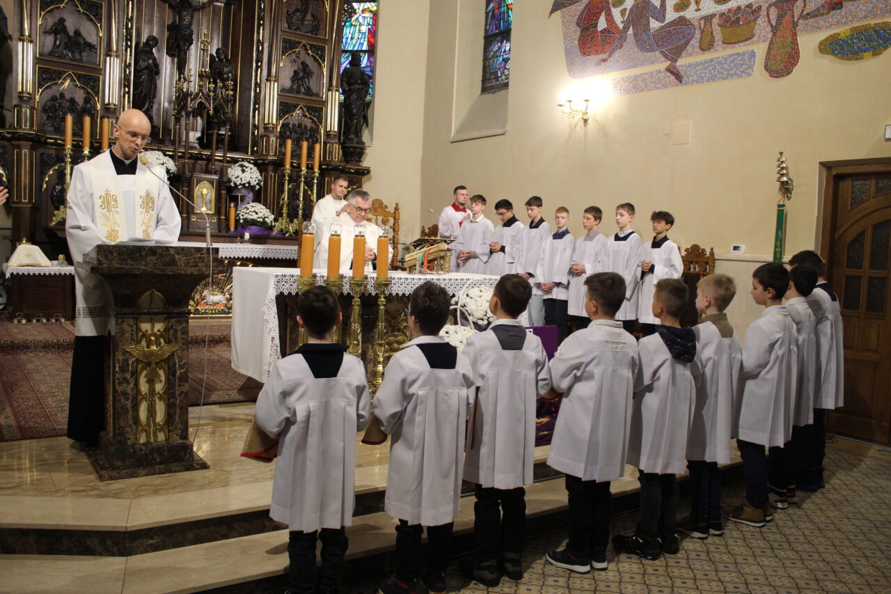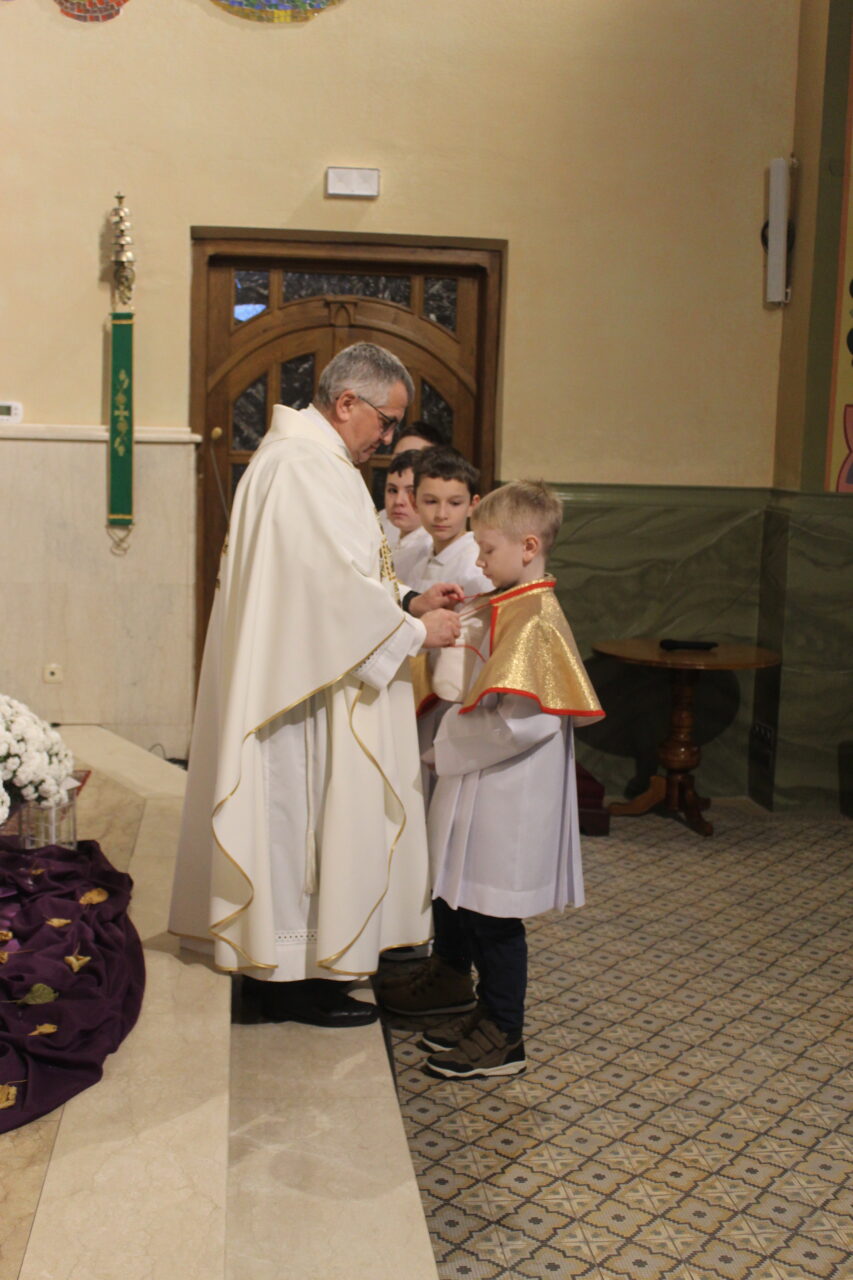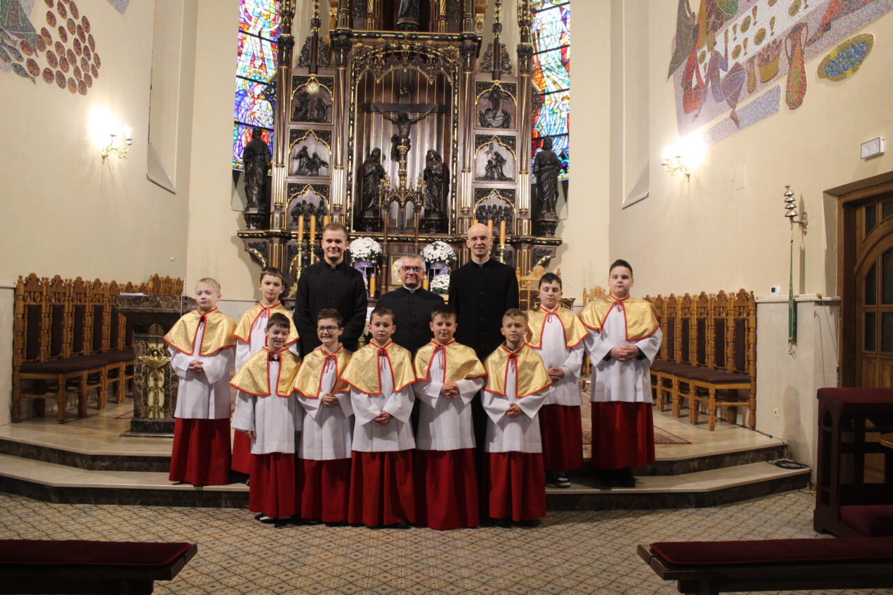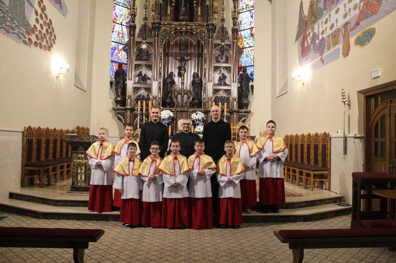 Ustanowienie nowych ministrantów miało miejsce podczas Mszy Świętej o godzinie 9.00. Po pozdrowieniu, Ksiądz Rafał, opiekun Liturgicznej Służby Ołtarza przedstawił 9 kandydatów i poprosił Księdza Proboszcza o włączenie ich do LSO. Na znak ich włączenia do Ministrantów, otrzymali pełny strój, jaki odtąd będą używać podczas pełnienia swej służby przy ołtarzu.