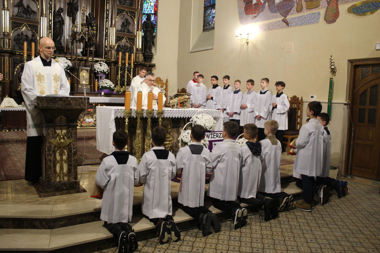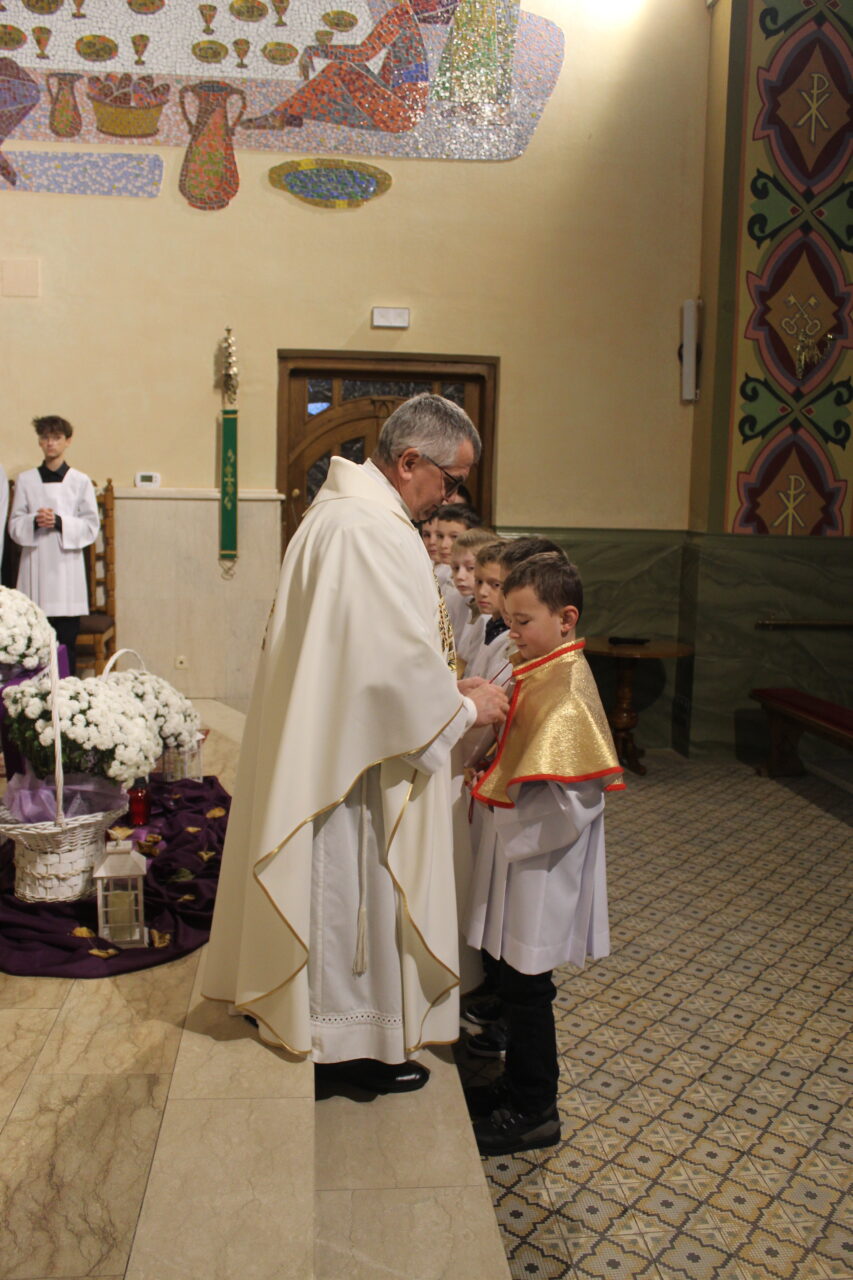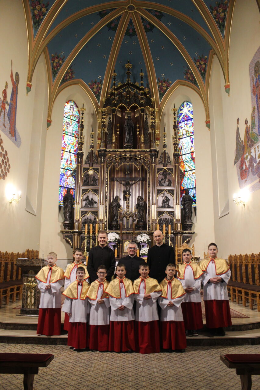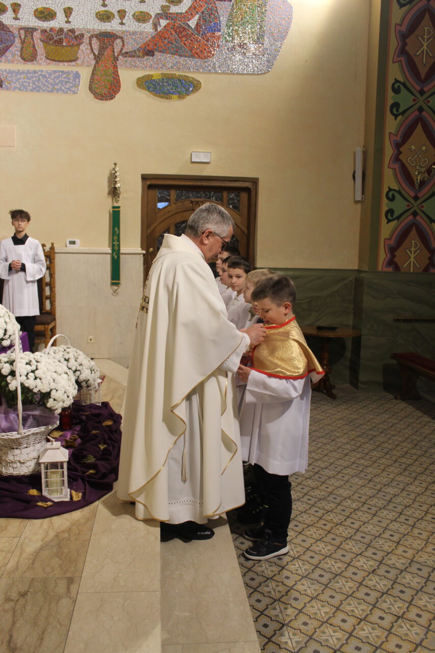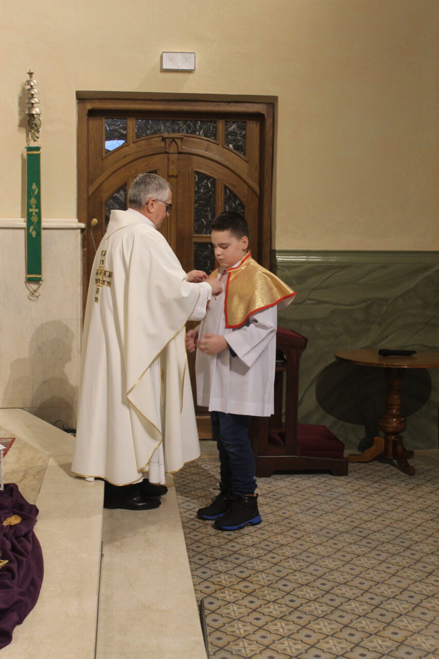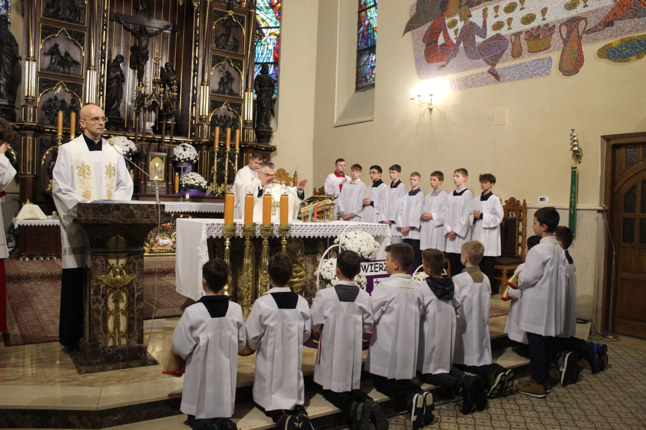 Ustanowienie nowych ministrantów miało miejsce podczas Mszy Świętej o godzinie 9.00. Po pozdrowieniu, Ksiądz Rafał, opiekun Liturgicznej Służby Ołtarza przedstawił 9 kandydatów i poprosił Księdza Proboszcza o włączenie ich do LSO. Na znak ich włączenia do Ministrantów, otrzymali pełny strój, jaki odtąd będą używać podczas pełnienia swej służby przy ołtarzu.