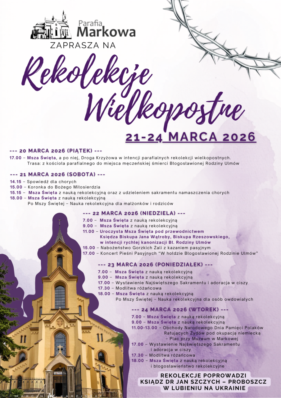 17.00 – Msza Święta, a po niej, Droga Krzyżowa w intencji parafialnych rekolekcji wielkopostnych. Trasa: z kościoła parafialnego do miejsca męczeńskiej śmierci Błogosławionej Rodziny Ulmow.